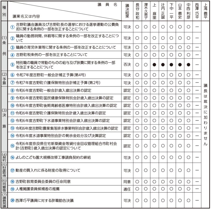 ◆一目でわかる審議結果[○=賛成 ●=反対 ー=欠席 △=棄権]
