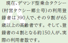 村内では、今後、高齢者による運転免許証の返納が増加すると見込まれることから、デマンド型乗合タクシーの利用者数も増加すると想定できますが、デマンド型乗合タクシーはすべての村民、高校生も利用可能です。積極的にご利用くださいますよう、まずは、登録をお願いします。