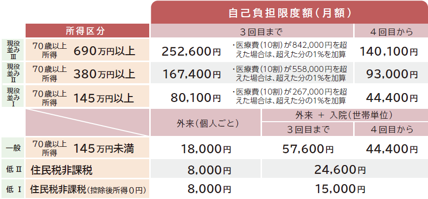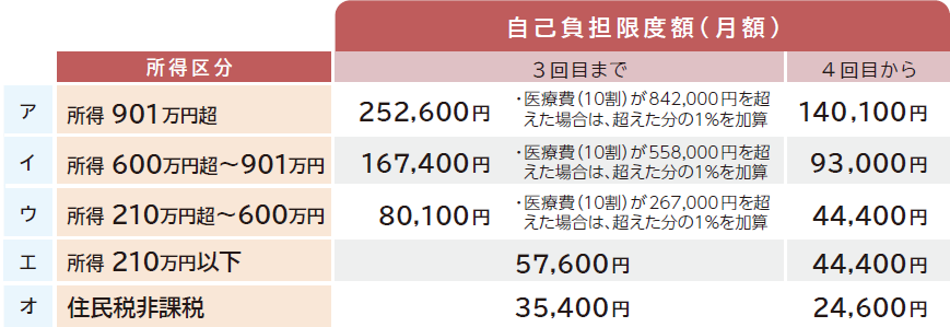・ひと月の医療費が高額になったとき、申請すると自己負担限度額を超えた分が「高額療養費」としてあとから払い戻されます。