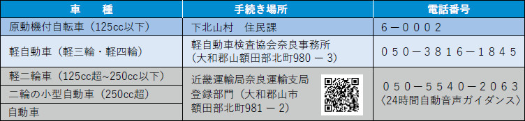 名義変更や住所変更、廃車、譲渡等は、下表の場所で手続きしてください。
