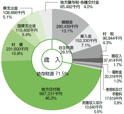 村に入ったお金は21億3,810万3千円(対前年度伸率△4.4%)