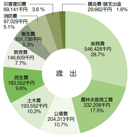 総務費:庁舎の維持管理や戸籍、徴税、選挙、監査事務など村の総括的な事務に使ったお金