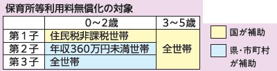 下表に該当するこどもの保育所等利用料を無償化しています。また、3〜5歳のこどもがいる多子世帯には、副食費の助成も行っています。