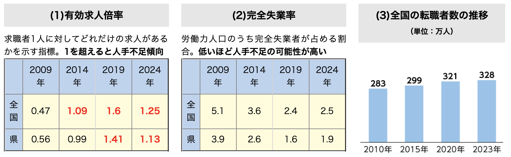 人口減少に伴って生じている企業の人手不足は、全国的に深刻な課題となっています。さらに、求人数が求職者数より多い「売り手市場」といわれる現在の就職市場の状況や転職の活発化も重なって、企業の人材確保はますます困難になりつつあります。