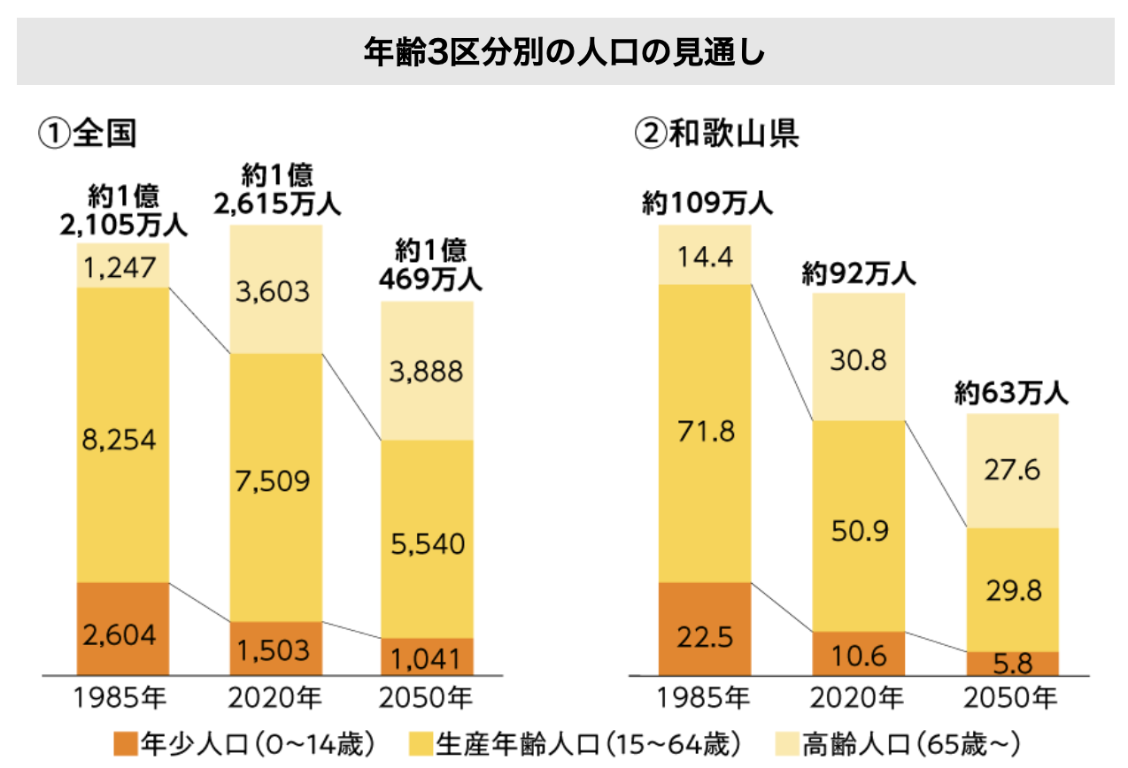 特に和歌山県では、今後より早いペースで人口減少が進み、2050年には「生産年齢人口」が1985年の約4割まで、「年少人口」が1985年の3割以下まで大きく減ることが予想されています。