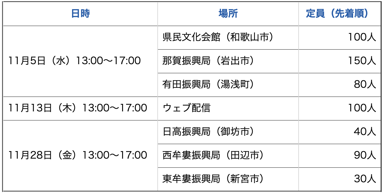 申込・問い合わせ:郵送、ファックス、Eメールで申込書(申込先、ウェブサイトで配布)を各開催日の1週間前までに県金融広報委員会