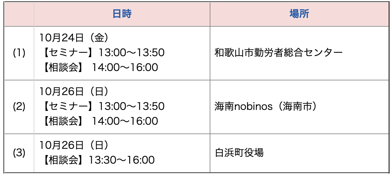 申込:電話、ファックスで氏名、電話番号、相談内容、希望日、会場を各開催日の3営業日前までにわかやま空き家相談窓口(セミナーは申込不要)
