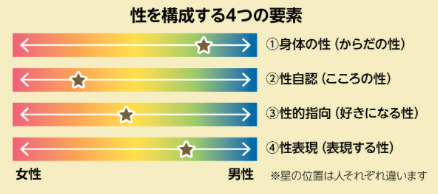 性は生まれたときに割り当てられた性だけでなく、大きく分けて4つの要素の組み合わせで成り立っており、一人一人異なります。組み合わせは多様で、性はグラデーションといわれます。性の多様性を知り、お互いを尊重することが大切です。
