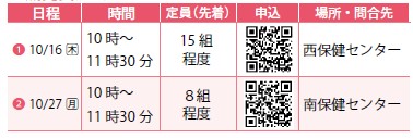 内容:妊婦・出産・出産後の話、妊娠中の栄養・歯の話、沐浴体験、妊婦体験ジャケットの着用等