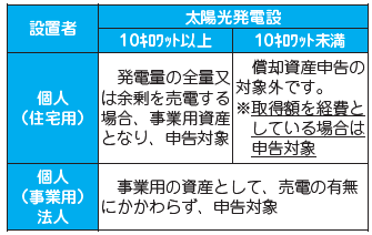 太陽光発電設備を設置している方へ:太陽光発電設備(太陽光パネル)の多くは事業用資産に分類され、償却資産の申告が必要です。個人が住宅用に設置したものでも、売電している場合は事業用資産となります。次の表で申告対象かご確認ください。
