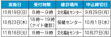 内容:問診・診察・身体測定・血圧測定・尿検査・心電図・血液検査