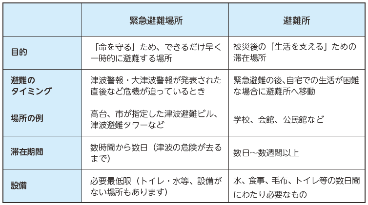 津波に関する「緊急避難場所」と「避難所」は、いずれも災害時に人々の命を守るための施設ですが、目的や避難のタイミング等が異なります。