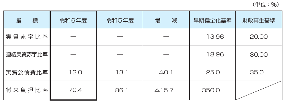 本市におきましては、一般会計等に赤字が出ていないため、実質赤字比率、連結実質赤字比率及び資金不足比率が発生していません。将来負担比率については、地方債現在高の減少に加え、財政調整基金等の充当可能基金が増加したことにより、前年度比15.7%の減となっており、早期健全化基準に達していません。また、実質公債費比率については、前年度比0.1%減で、早期健全化基準に達していません。