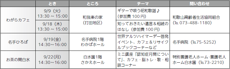 ※カフェほほえみの和、ほほえみの和・竜門ですよ、いこいカフェの開催情報については「福祉きのかわ」を確認ください。