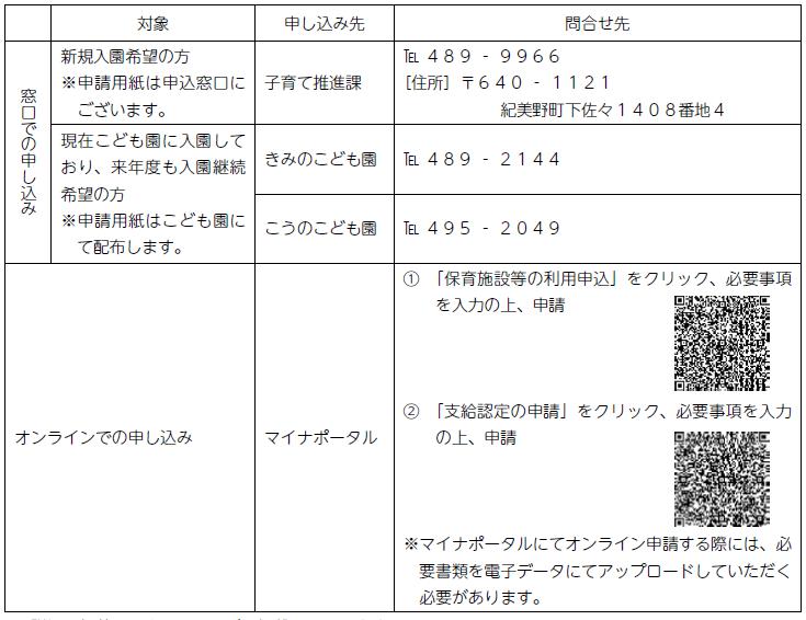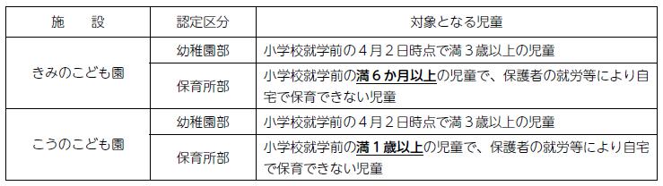 対象児:保護者、児童が紀美野町内に住民票を有し、集団保育(教育)可能で、次の表の対象となる児童