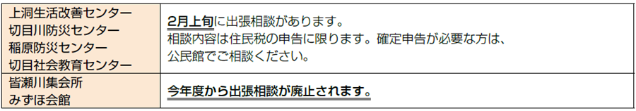 住民税出張相談:6か所から4か所となります。時期が2月末から2月上旬となります。