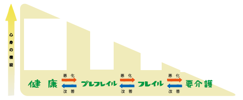 「フレイル」とは、病気ではないけれど、年齢とともに、筋力や心身の活力が低下し、介護が必要になりやすい状態のことです。
