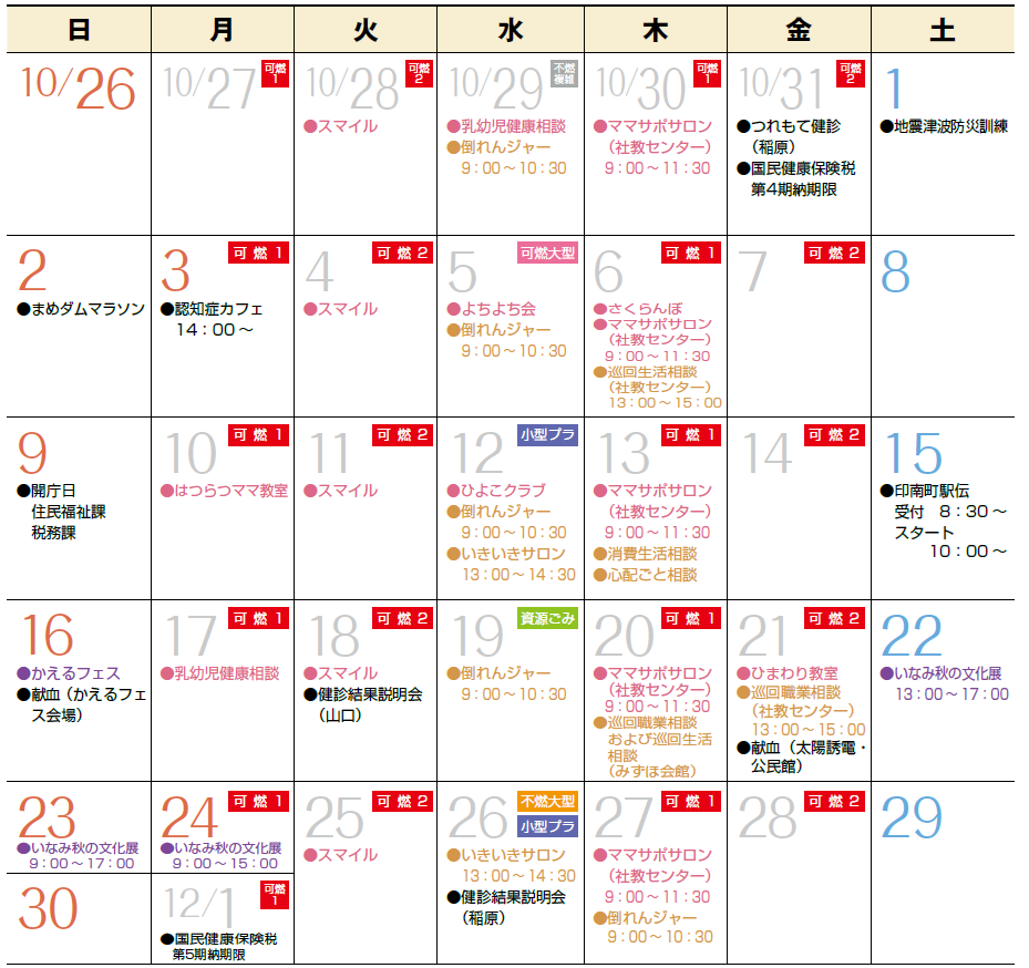 くらし 2025年令和7年 11月号まちのカレンダー 11/14 前の記事 次の記事 発行日 : 2025年11月01日 自治体名 : 和歌山県印南町 広報紙名 : 広報いなみ 令和7年11月号 No.364 可燃1の地区…印南・切目地区 可燃2の地区…稲原・切目川・真妻地区 ※ごみは収集日の当日午前7時までに出してください。 Tweet シェアする いなみ掲示板(3) 人の動き