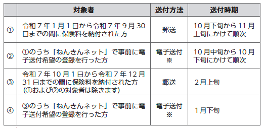 このため、日本年金機構から、以下のスケジュールで「社会保険料(国民年金保険料)控除証明書」が対象者宛てに発送されます。お手元に届きましたら、大事に保管し、年末調整や確定申告の際に使用してください。