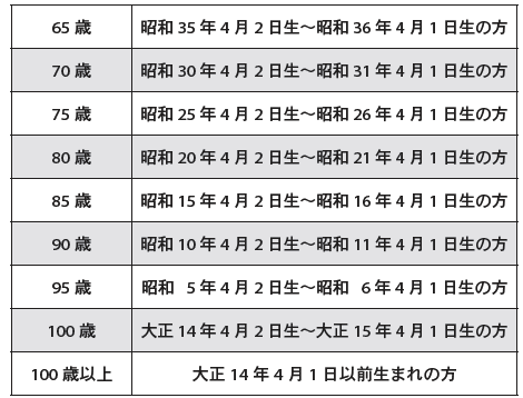 令和7年度から実施されている帯状疱疹予防接種につきまして、4月に対象者へ案内を送付しております(対象者については下表参照)。