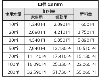 ・料金の計算方法を用途別(家事用、業務用)から口径別(13mm、20mmなど)に変更