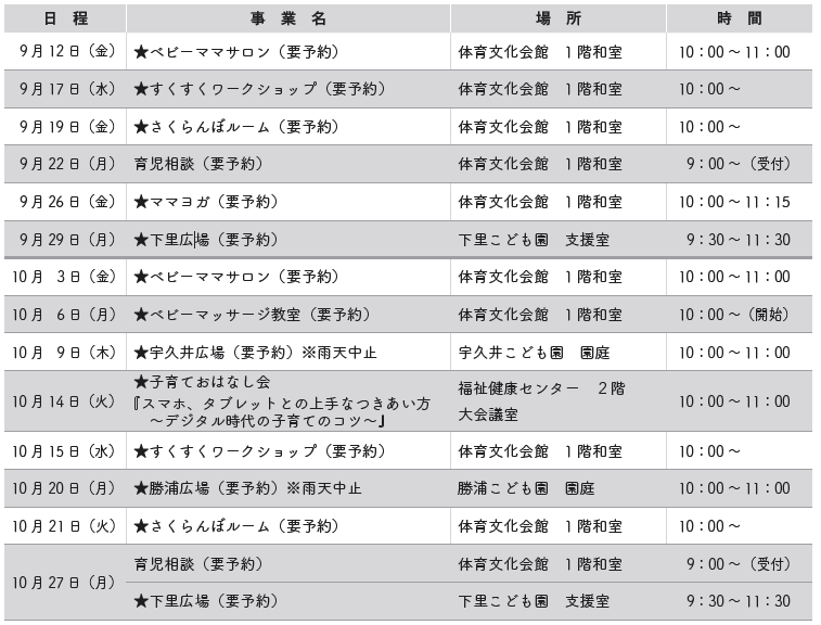 子育て 子育てイベントカレンダー(~10月) 20/29 前の記事 次の記事 発行日 : 2025年09月05日 自治体名 : 和歌山県那智勝浦町 広報紙名 : 広報なちかつうら 2025年9月号 お問い合わせ先: ・★印の事業…地域子育て支援センター【電話】52-0224 ・その他の事業…子育て世代包括支援センター【電話】29-7215 Tweet シェアする 【イベント情報】「交通安全コンサート 新翔高校&県警音楽隊」 いやしの音〜町立温泉病院だより