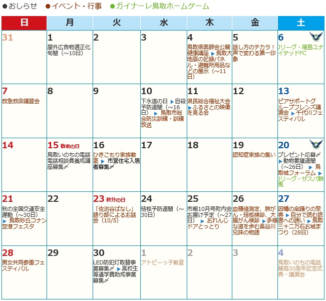 くらし 9月カレンダー / 2025年(令和7年) 44/46 前の記事 次の記事 発行日 : 2025年09月01日 自治体名 : 鳥取県鳥取市 広報紙名 : とっとり市報 令和7年9月号 ※紙面の都合上、行事を抜粋し、名称を省略して掲載しています。また、日程は変更される場合があります。 Tweet シェアする 各施設催し物のご案内(2) 今月のプレゼント