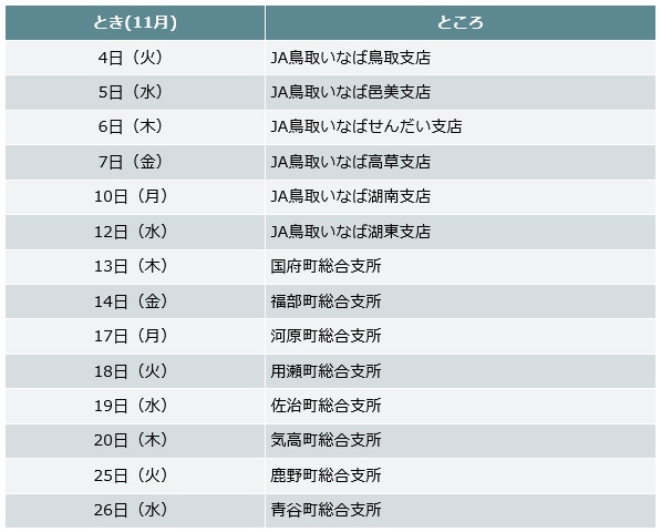 相談日の1週間前までに農業委員会事務局、JA鳥取いなば各支店(鳥取地域)、各総合支所産業建設課にお申し込みください。