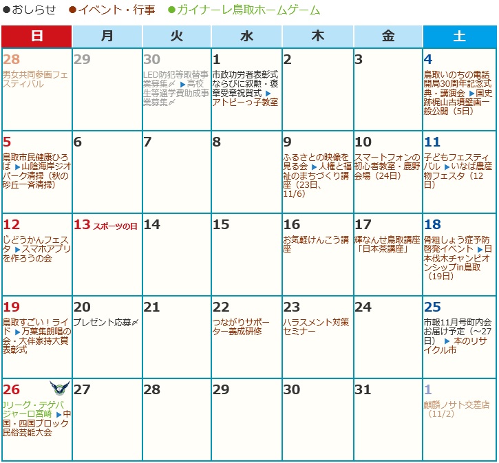 くらし 10月カレンダー / 2025年(令和7年) 44/46 前の記事 次の記事 発行日 : 2025年10月01日 自治体名 : 鳥取県鳥取市 広報紙名 : とっとり市報 令和7年10月号 ※紙面の都合上、行事を抜粋し、名称を省略して掲載しています。また、日程は変更される場合があります。 Tweet シェアする 各施設催し物のご案内(3) 今月のプレゼント