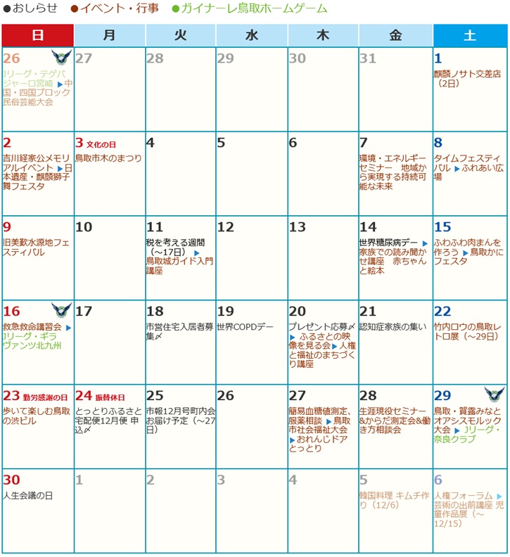 くらし 11月カレンダー / 2025年(令和7年) 47/49 前の記事 次の記事 発行日 : 2025年11月01日 自治体名 : 鳥取県鳥取市 広報紙名 : とっとり市報 令和7年11月号 ※紙面の都合上、行事を抜粋し、名称を省略して掲載しています。また、日程は変更される場合があります。 Tweet シェアする 各施設催し物のご案内(3) 今月のプレゼント