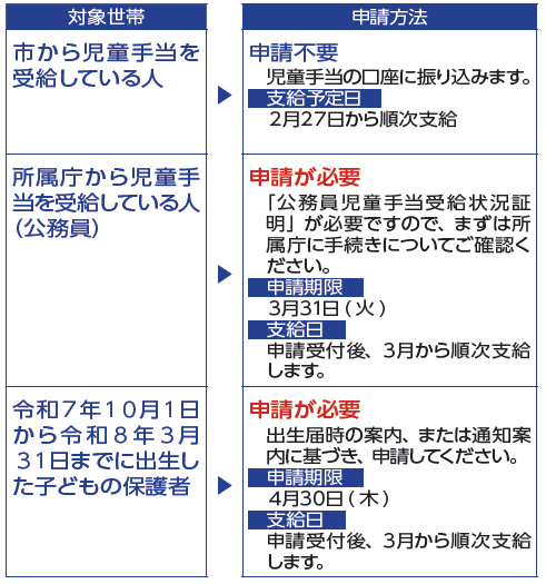 ・令和7年10月1日から令和8年3月31日までに出生した児童の保護者のうち、生計を維持する程度の高い人