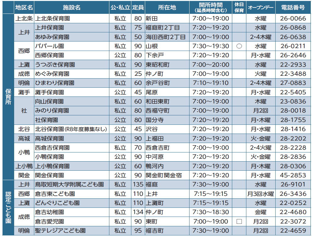 ※休日保育欄の○は市で実施(委託含む)、□は園の自主事業です。自主事業の詳細は園にお問い合わせください。