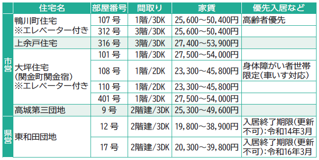 ・単身世帯(60歳以上の高齢者、障がい者などの要件あり)は2DK以下のみ応募可能