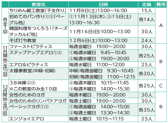 料金:費用(受講料)Aは600円(材料費別)、Bは9,150円、Cは6,100円(B・Cは保険料込)。初回全納・返金不可。