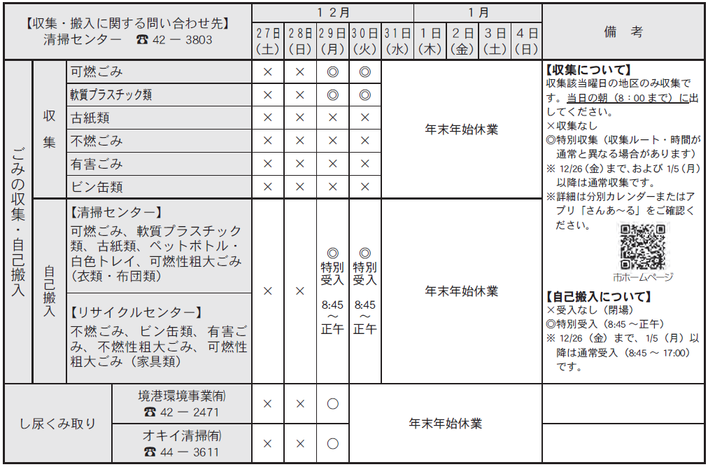 くらし 年末年始のごみ等の収集について 3/42 前の記事 次の記事 発行日 : 2025年12月01日 自治体名 : 鳥取県境港市 広報紙名 : 市報さかいみなと 令和7年12月号 Tweet シェアする 境港市フォトコンテスト2025 年末年始の業務のお知らせ