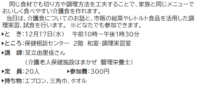 ■家族介護教室「おそうざいをアレンジ・介護食づくり」 要申込