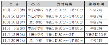 来年4月から小学校に入学する児童の健康診断を行います。保護者に9月中旬に送付しました「就学時健康診断通知」を確認のうえ、指定された会場(各小学校)で受けてください。