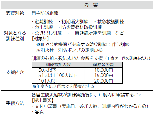 地域の皆さまが地元の自然災害を知り、災害に関する基礎的な知識を習得するとともに、防災・減災への意識の高めることを目的として、町では自主防災組織が自ら防災訓練を実施した場合に、奨励金を交付しています。