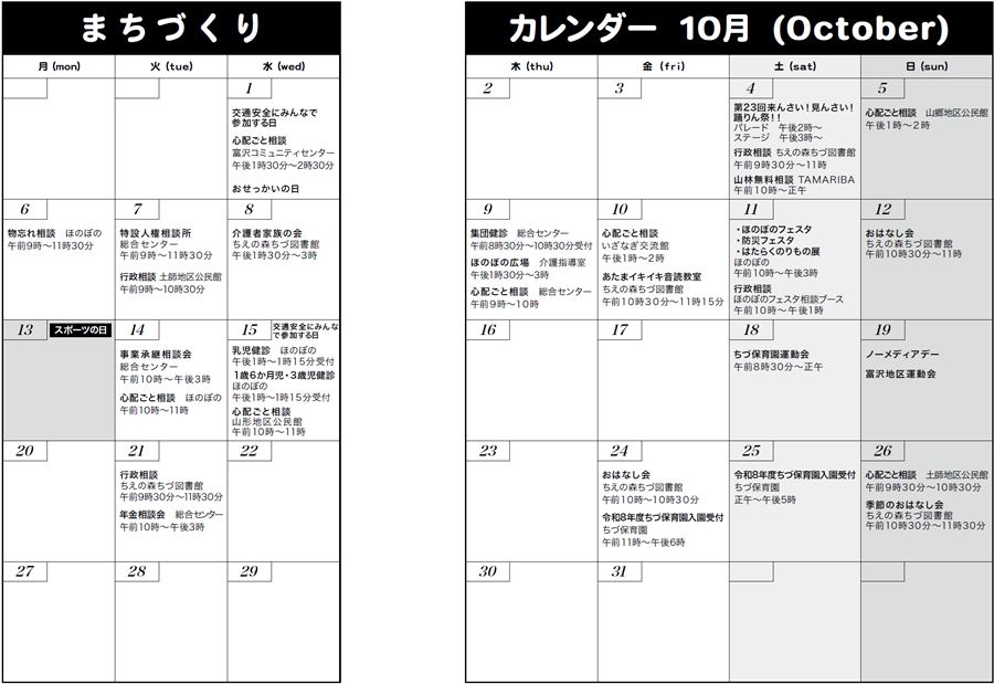 くらし まちづくりカレンダー10月(October) 19/25 前の記事 次の記事 発行日 : 2025年09月20日 自治体名 : 鳥取県智頭町 広報紙名 : 広報ちづ 2025年10月号 *日程は、変更する場合があります。 Tweet シェアする おしえて!メンドーザ先生 宝くじ文化公演 紺野美沙子 講演と朗読