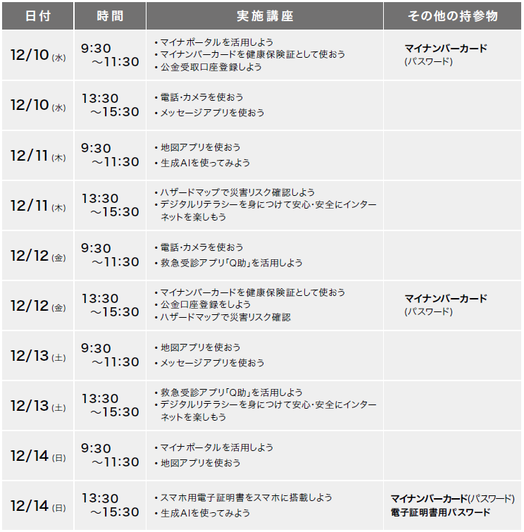 総務省デジタル活用支援推進事業として、スマホの基礎をはじめ、これからの生活に欠かせない知識や操作方法・行政手続きなど、楽しく・分かりやすく学べる講習会です。