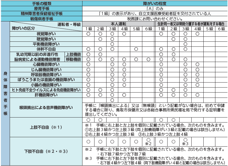 身体などに障がいがあり、下表に該当する人は減免になる場合があります。また、下表に該当する障がいのある人の通勤・通院・通所のために介護をする人が運転する場合も対象になります。