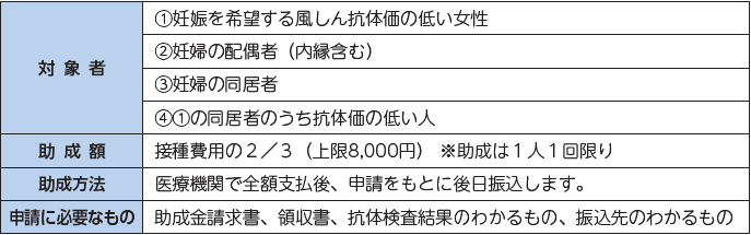 この病気を防ぐため、町では予防接種費用の助成を行っています。未来の赤ちゃんを守るため、対象者は風しんの予防接種をご検討ください。