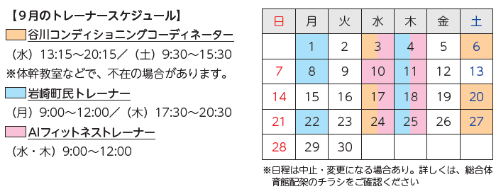 持ち物:スポーツウェア、屋内用シューズ、飲み物(ふた付き容器)、タオル