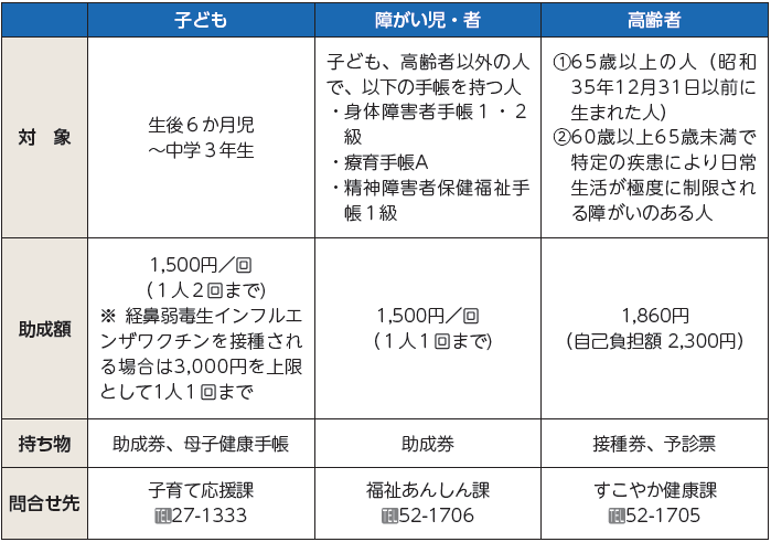 季節性インフルエンザの予防接種が始まります。以下の表の対象者には助成券や接種券を送付しますので、接種を希望される場合は説明書をよく読み、必要書類を持って接種してください。