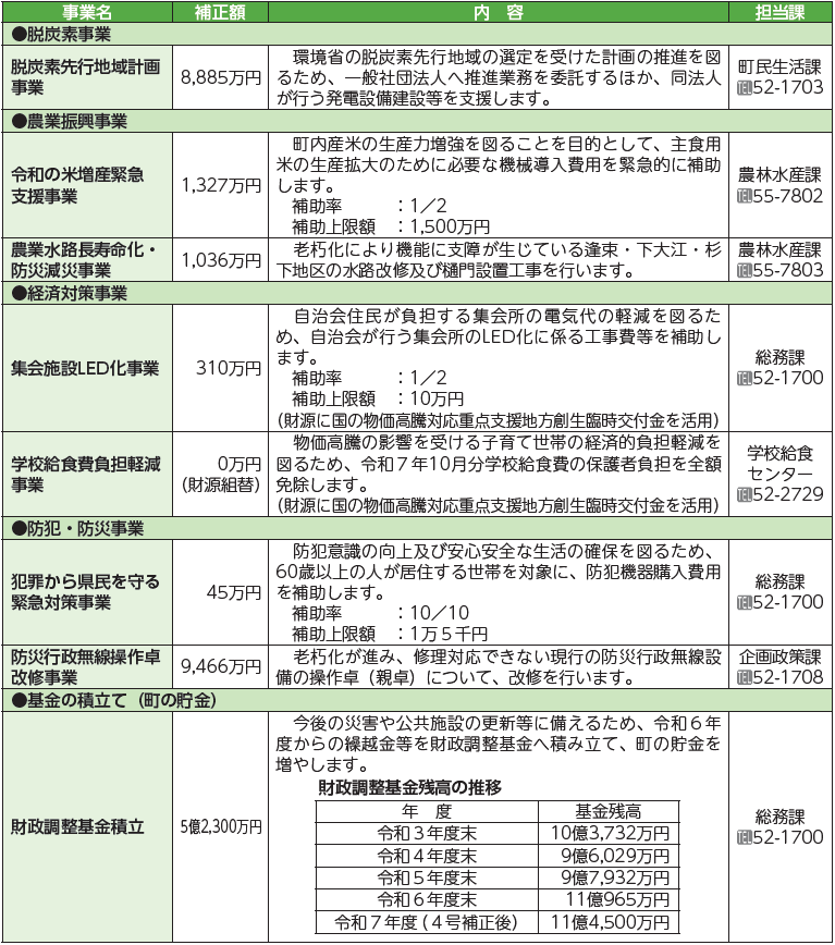 脱炭素先行地域計画事業、令和の米増産緊急支援事業等の農業振興事業、国の物価高騰対応重点支援地方創生臨時交付金を活用した経済対策事業など各種事業の追加(4号補正)、当初予定していた携帯電話網を活用した防災行政情報システム導入にかかる予算を減額し、防災行政無線操作卓改修事業にかかる予算を増額する予算(5号補正)が9月定例議会で可決されました。