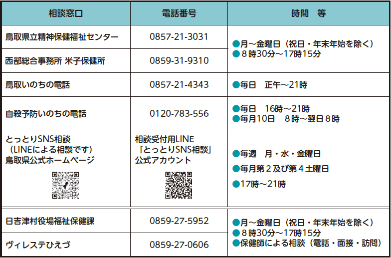 全国では年間2万人を超える人の命が自死によって失われています。鳥取県の自死死亡率は全国で最少となっていますが、依然として年間60人以上の方が自死に追い込まれています。悩んでいる時は1人で抱え込まず、誰かに相談をしてみましょう。