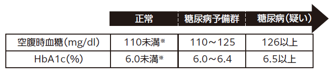 ※空腹時血糖100~109mg/dl(正常高値)とHbA1c5.6~5.9%は将来、糖尿病を発症するリスクがそれ未満の人よりも高く、高血圧や脂質異常があるとより危険であり、改善が望まれる状態です。