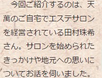 南部町内で育ち、3人のお子さんを育てる母親でありながら、ご自宅でエステサロン「Rutile」を営む田村珠希さん。もともとは別の仕事をされていた田村さんですが、お子さんの育休中にネイルの資格を取得するなど、いろいろ勉強する中で、ご自身の肌トラブルをきっかけにエステに興味を持ちました。町内にエステサロンが少なかったこともあり、「同じ悩みを抱える方の力になりたい」と、勉強を重ねて自宅の一室でサロンを始めました。