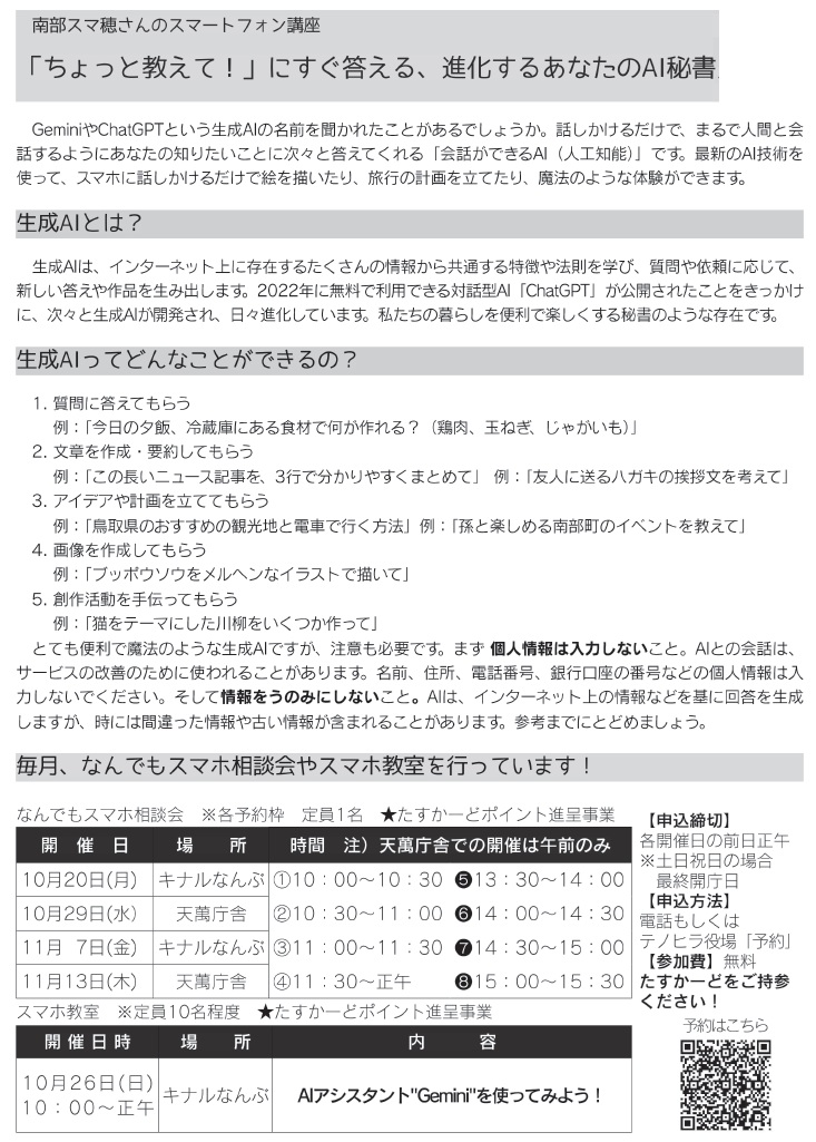 くらし デジタル推進課からのお知らせ 10/32 前の記事 次の記事 発行日 : 2025年10月02日 自治体名 : 鳥取県南部町 広報紙名 : 広報なんぶ 2025年10月号 問合せ:デジタル推進課 【電話】46-0108 Tweet シェアする キナルなんぶ イベント情報! デザイン機構通信 10月号 ~人と人、笑顔と笑顔をつなぐ~
