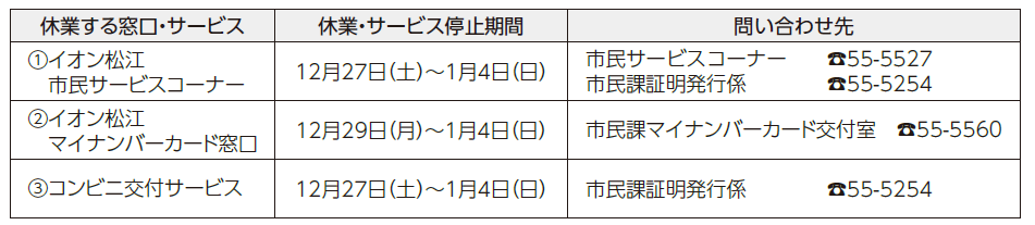 【HP】(1)、(3)は『松江市 市民サービス』で検索、(2)は『松江市 年末年始 マイナ』で検索